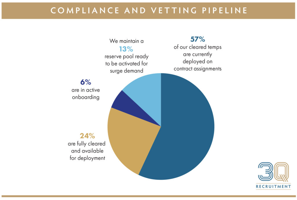 At 3Q Recruitment, quality assurance is supported by an actively managed compliance and vetting pipeline. At any given time, 57% of our fully cleared temporary workforce is deployed on live contract assignments, supporting continuity of service across healthcare, community and social care settings.